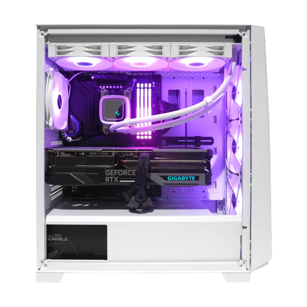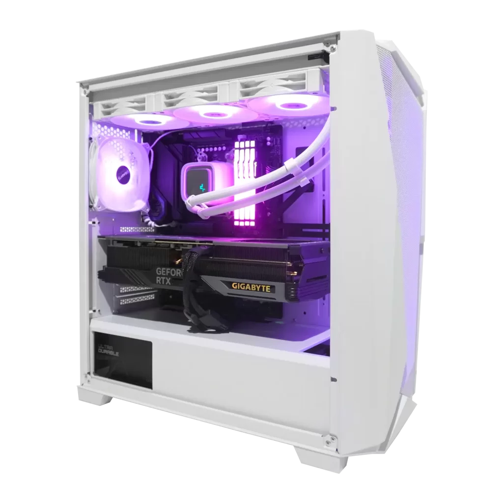Solo los componentes más avanzados y poderosos, ensamblados sobre un elegante gabinete de Media Torre con un gran frente de malla y un panel superior ventilado, brindando un generoso flujo de aire para una refrigeración optimizada con una estética premium, panel lateral de cristal templado con su vistosa iluminación por RGB; Incomparable para proyectar un Estilo Único.